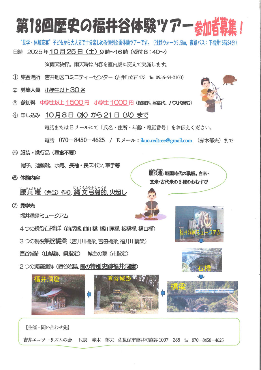 毎年大人気の吉井エコツーリズムの会主催「第18回 歴史の福井谷体験ツアー 」の参加者を募集いたします。
